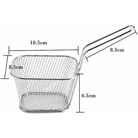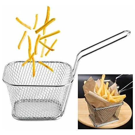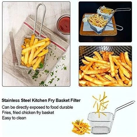Cestello per friggere in acciaio inossidabile Costruito in acciaio inossidabile di alta qualità, robusto e durevole, privo di corrosione, non si arrugginisce, non si piega, non si rompe o si indebolisce facilmente Il materiale in acciaio inossidabile per uso alimentare consente di toccare direttamente gli alimenti in modo sicuro e facile da pulire Perfetto l’impugnatura in metallo consente alle dita goffe di tenersi ben salde. È anche comodo da riporre poiché il manico può essere appeso al muroPiccolo cestino per patatine fritte ideale per patatine fritte, bastoncini di pollo, anelli di cipolla, gamberetti o qualsiasi altro cibo fritto, potrebbe anche essere un cestino per snack Cestino per patatine fritte individuale ideale per un bar, ristorante o a casa tua, permettendoti di cucinare, bollire o friggere cibi con facilità, molto conveniente