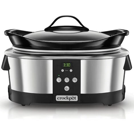 Crock Pot Slow Cooker, pentola per cottura lenta da 5,7 litri, adatta fino a 6-8 persone. Cucina lentamente a bassa temperatura (95-98°) restituendo ricette succulente e gustose. Cucina mantenendo inalterate le proprietà degli alimenti, rendendo morbida a gustosa qualsiasi tipo di ricetta. Si riempie velocemente con gli ingredienti necessari, si accende e poi fa tutto da sola. Display digitale e programmabile con 2 impostazioni di cottura: Low (richiede tempi più lunghi di cottura) e High (per tempi di cottura più brevi). Al termine della cottura passa automaticamente in Warm: mantiene così in caldo il cibo fino al momento di servirlo. La pentola interna, in ceramica, è estraibile dalla base e può essere utilizzata anche in forno. Può essere lavata in lavastoviglie, insieme al coperchio in vetro. Contenuto della confezione