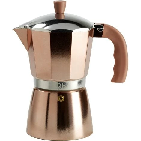 Fluo di Q.b. by Mopita, caffettiera in alluminio, 6 tazze, manico antiscottatura, color rose gold. Colora la tua cucina con le caffettiere della linea Fluo di Q.b. by Mopita. In alluminio, color gold, e guarnizione in silicone. Fondo adatto a tutti i piani cottura, eccetto quelli a induzione. Disponibile da 1, 3 e 6 tazze.
