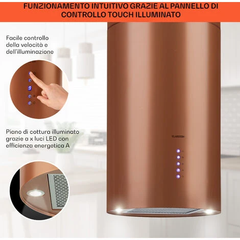 Raffinatissimo è anche l’aspetto estetico della cappa a isola Beretta di Klarstein: l’alloggiamento rotondo in acciaio inox spazzolato dona alla cappa uno splendore impeccabile.
