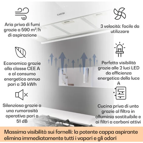 POTENTE VENTOLA ANTIFUMO: Con 3 livelli di potenza e 590 m³/h di flusso, le nostre cappe aspiranti riducono gli odori e filtrano i fumi per una migliore qualità dell’aria. Il suo timer di spegnimento automatico spegne la cappa quando non è in uso.