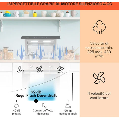 La Cappa Aspirante Downdraft Royal Flush di Klarstein aspira in modo fulmineo vapori sgradevoli: il suo design estraibile con grandi funzionalità è ideale per cucine americane con isola, piani cottura davanti alle finestre o per essere adattata nelle cucine già attrezzate. E con il suo conveniente rapporto qualità-prezzo l’acquisto della Royal Flush sarà un vero affare!