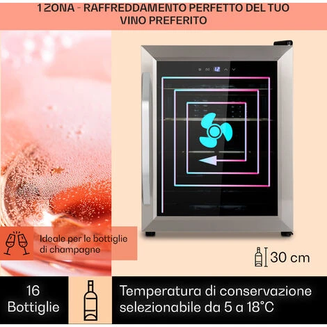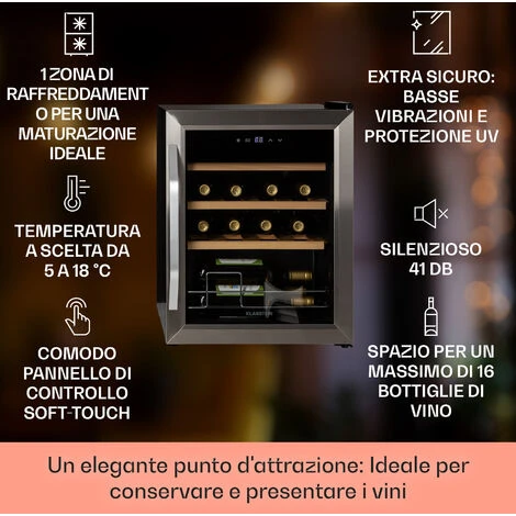 Il frigorifero per vini Vinamour 16 Uno di Klarstein impreziosisce ulteriormente le tue scorte di vino e, grazie al suo raffinato telaio in acciaio inox spazzolato, si fa notare anche nella zona bar. Inoltre, il grande sportello in vetro mette in mostra i tesori all’interno della cantinetta. Sui tre ripiani in legno estraibili nel vano interno da 42 litri è possibile conservare ben 16 bottiglie di vino. L’illuminazione interna le mette straordinariamente in risalto, mentre il raffreddamento può essere gestito facilmente grazie ai controlli touch.