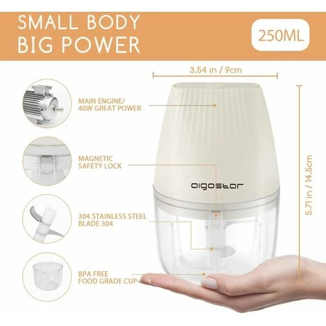 Il tritatutto elettrico dotato di un motore da 40 Watt ad alte prestazioni con tre lame affilate, che possono facilmente tritare aglio, cipolla, prezzemolo, formaggio, arachidi e altri ingredienti piccoli entro 10 secondi. Con una capacit di 250 ml, il tritatutto perfetto per soddisfare le tue esigenze di portata.