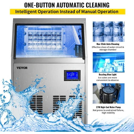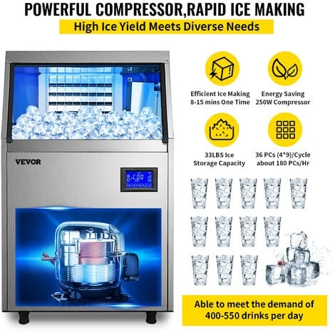 Fabbricatore di ghiaccio commerciale dotato di pannello di controllo LCD intelligente con pulsanti chiari a colpo d’occhio. Lo stato della macchina è monitorato in tempo reale e la funzione di rilevamento automatico rivela problemi di funzionamento quando la macchina smette di produrre ghiaccio. Il compressore potente garantisce prestazioni affidabili e minori consumi energetici inferiori. Deposito di ghiaccio di 33 libbre (15 kg).