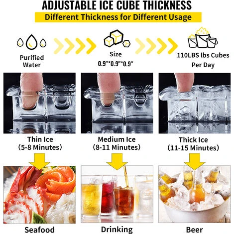 Il vassoio del ghiaccio multi-griglia di 36 pezzi (4 x 9) può produrre 110 libbre di ghiaccio ogni 24 ore. I cubetti di ghiaccio cristallini standard e squisiti hanno dimensioni di 0,9″ x 0,9″ x 0,9″ (22 x 22 x 22 mm). La capacità di stoccaggio del ghiaccio può raggiungere fino a 50kg/33 libbre.